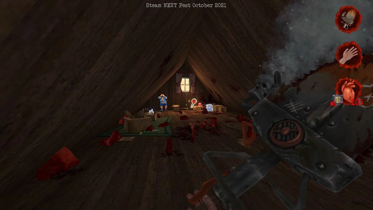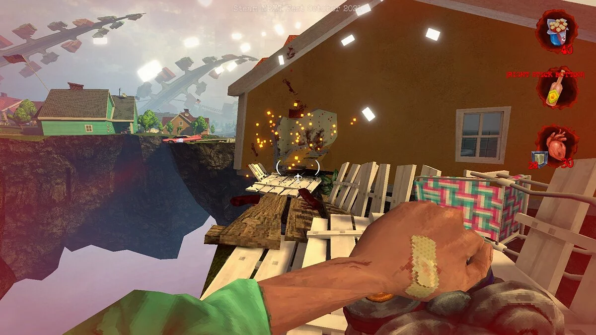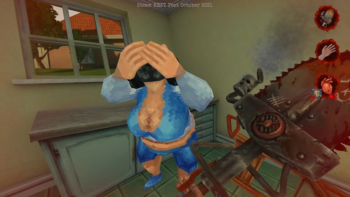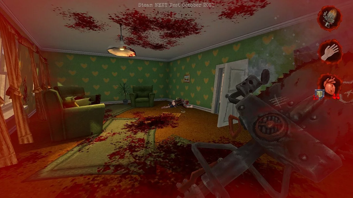 А ещё в Brain Damaged есть занятное нововведение. С помощью пилы безумный герой может блокировать выстрелы и отправлять их обратно. Если вовремя использовать способность, дедуля с дробовиком падёт от своего же залпа. Пользоваться навыком приходится регулярно: врагов много, они метко стреляют даже с большого расстояния, а здоровья Чуваку не хватает.