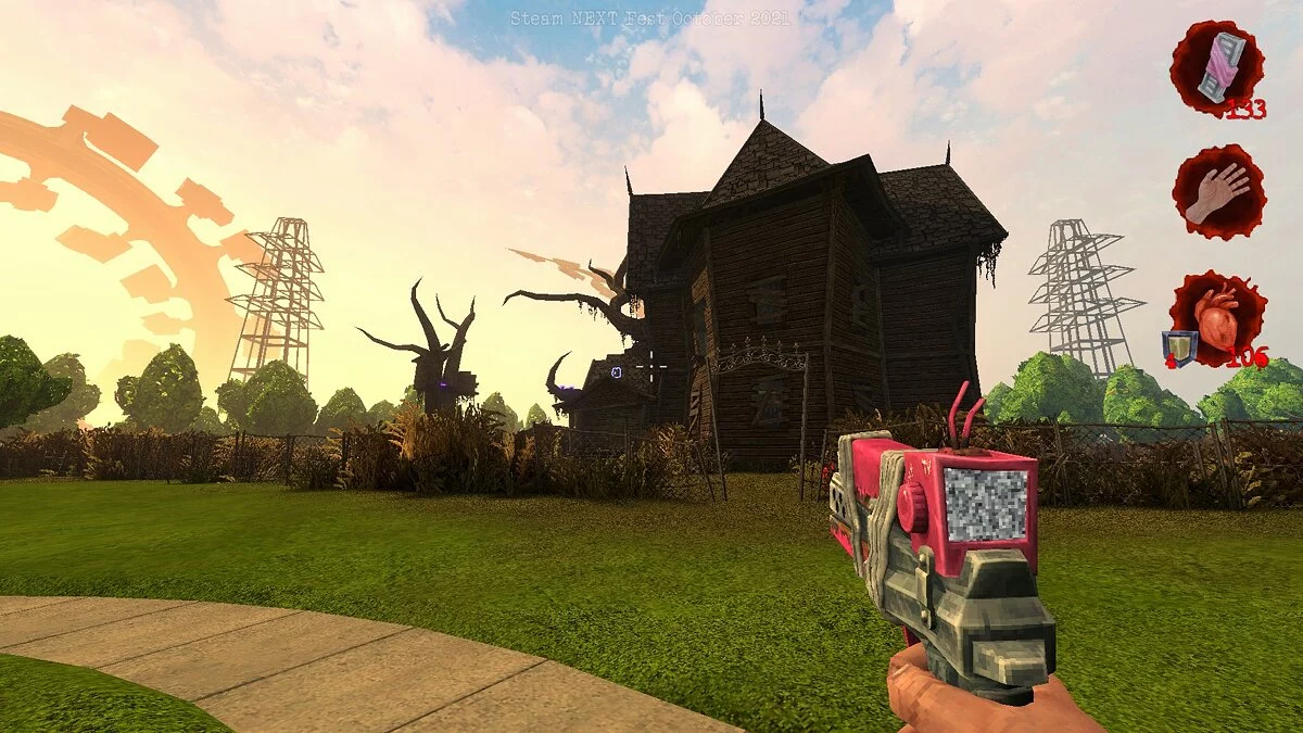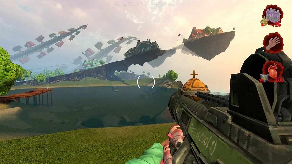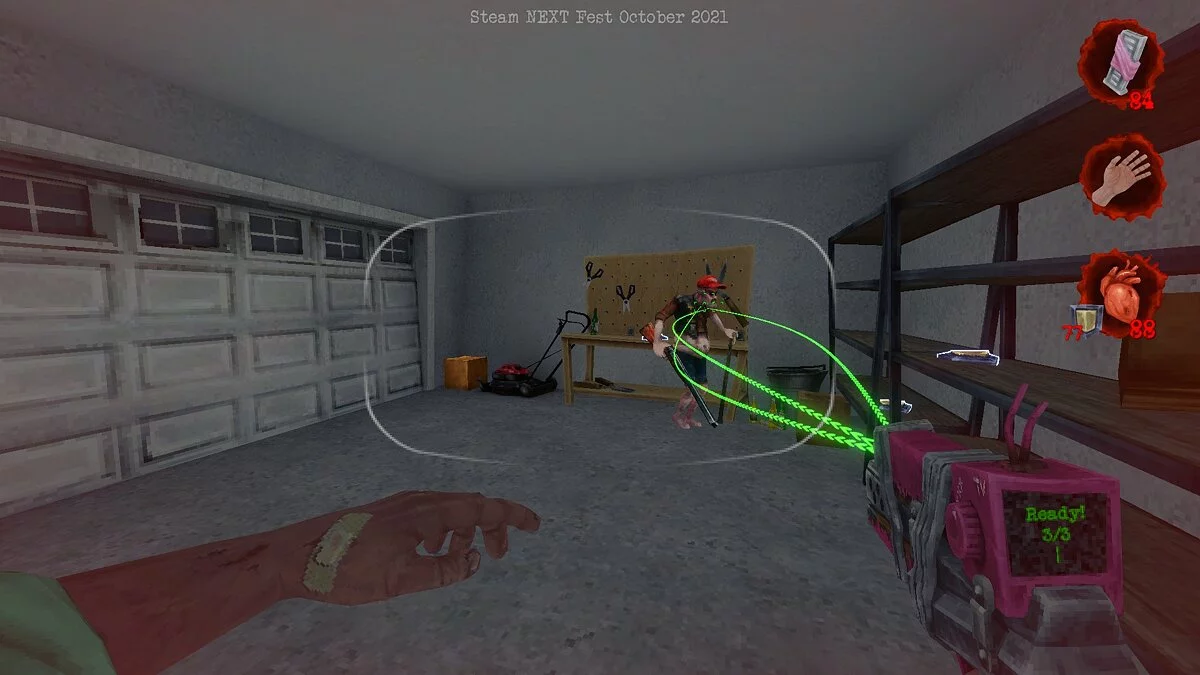 Даже в демо Чувак может найти немало смертоносных игрушек. Циркулярная пила, которой можно порезать негодяев на кусочки. Смарт-пистолет, напоминающий умную пушку из Titanfall, — если прицелиться, пули с помощью самонаведения доберутся до врага. Полезный в ближнем бою дробовик, к которому присобачили цепь, — с её помощью можно преодолевать препятствия и подтягиваться к оппоненту. Ракетница, которая ещё и святыми гранатами может пулять. В общем, с арсеналом всё неплохо.