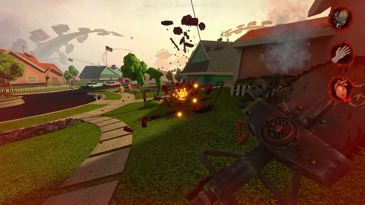 В демо доступен один уровень. Это небольшой городок, где люди жарили барбекю, выгуливали питомцев и наслаждались жизнью, пока не явился Чувак. Такая размеренная жизнь ему не по душе, поэтому он достаёт ствол и развязывает бойню.