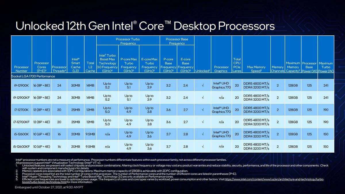 Компания Intel официально представила 12-е поколение процессоров под кодовым названием Alder Lake. Первыми в продажу поступят шесть моделей с разблокированным множителем (индекс К), всего в линейку войдет 60 моделей.