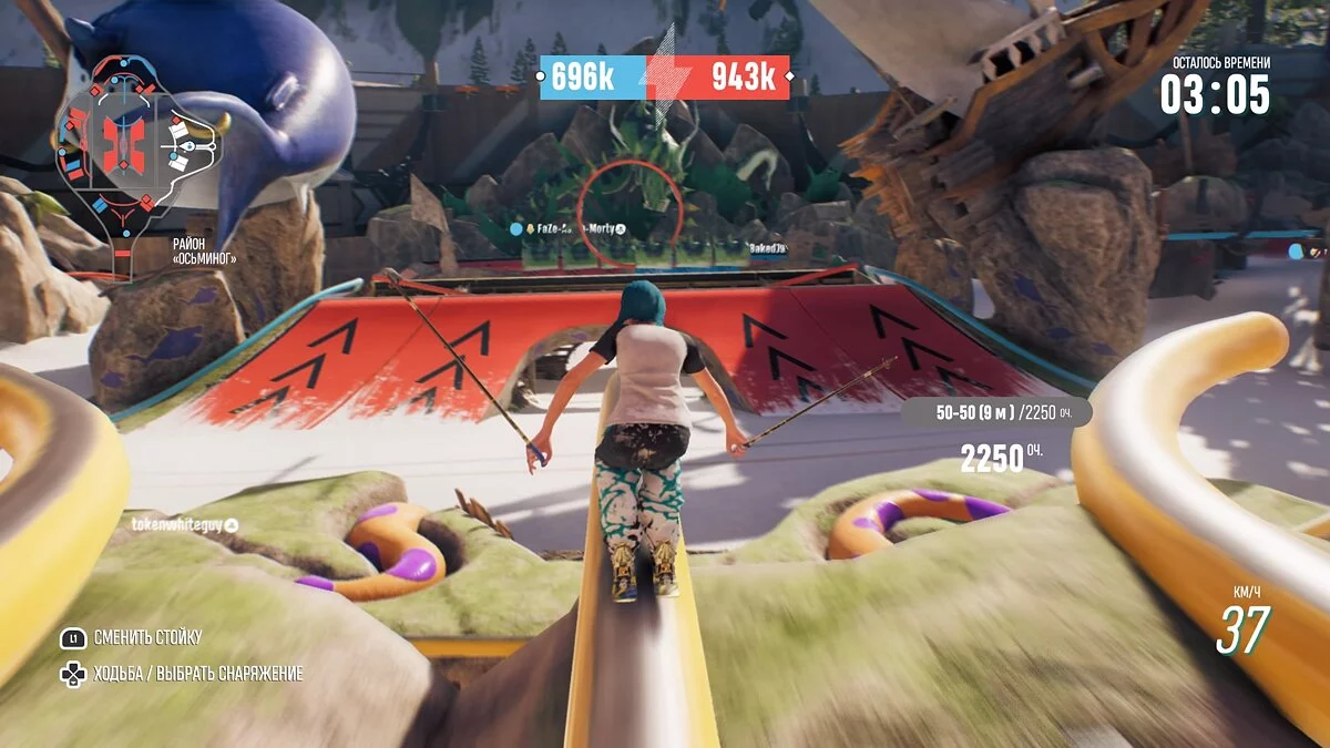 При этом команда, которая выбила на определённом участке больше очков, перекрашивает его в свой цвет. Чем больше на арене площадок вашего цвета, тем солиднее будет награда за исполненный трюк.
