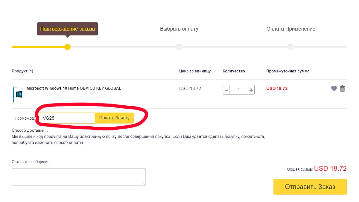 После этого перейдите на страницу товара. Нажмите кнопку «Купить сейчас», в результате чего вы окажитесь на новой страничке, на которой вам потребуется ввести промокод VG25. Он позволит получить дополнительную скидку 33%. После того, как вставите его в специальное поле (указано на скриншоте), нажмите кнопку «Подать заявку».