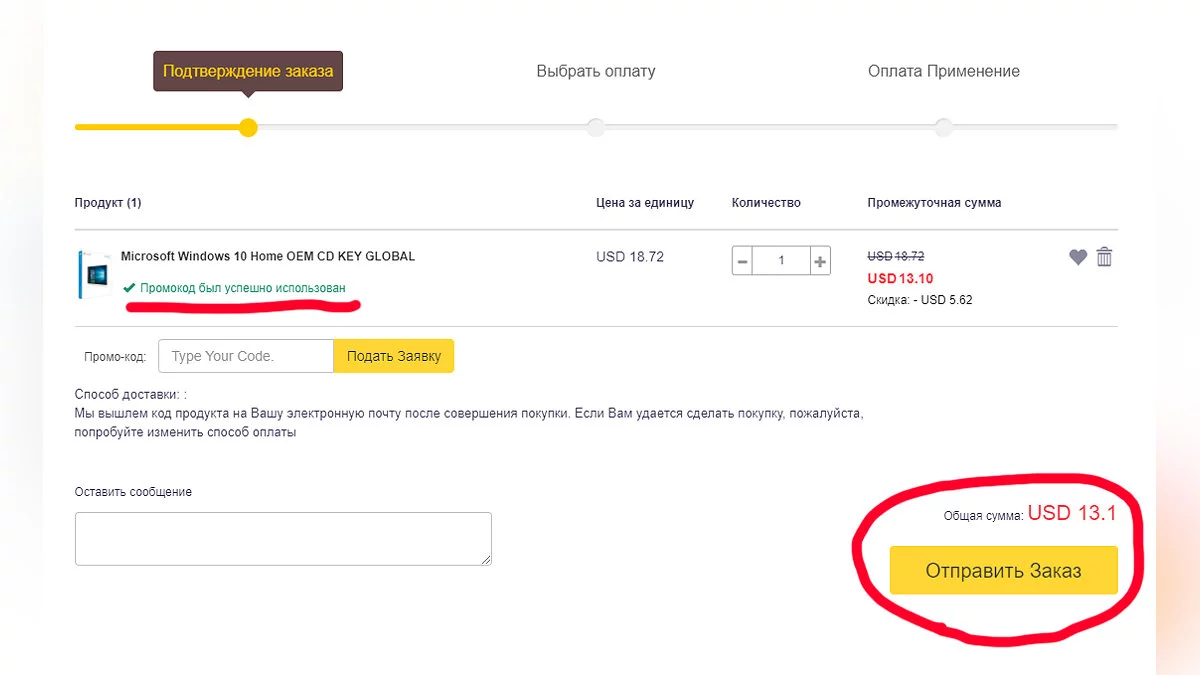Если все сделано правильно, на экране появится сообщение: «Промокод был успешно использован». Цена будет снижена до той, что указана выше (в перечне скидок).
