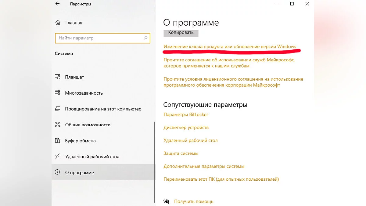 Перейдите в это меню, после чего нажмите кнопку «Изменение ключа продукта или обновление системы Windows». Она находится под характеристиками устройства и выглядит в виде кликабельного текста.