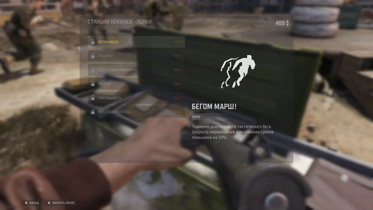 На поле боя можно найти валюту — также ей награждают за успешные действия. Раз в пару раундов сбережения можно потратить на расходники вроде метательных ножей и гранат, пушки и перки. За скромную сумму герой может научиться быстрее бегать, сможет надеть противогаз, расширить область миникарты, заставить экран мигать, если его заметят, и так далее.