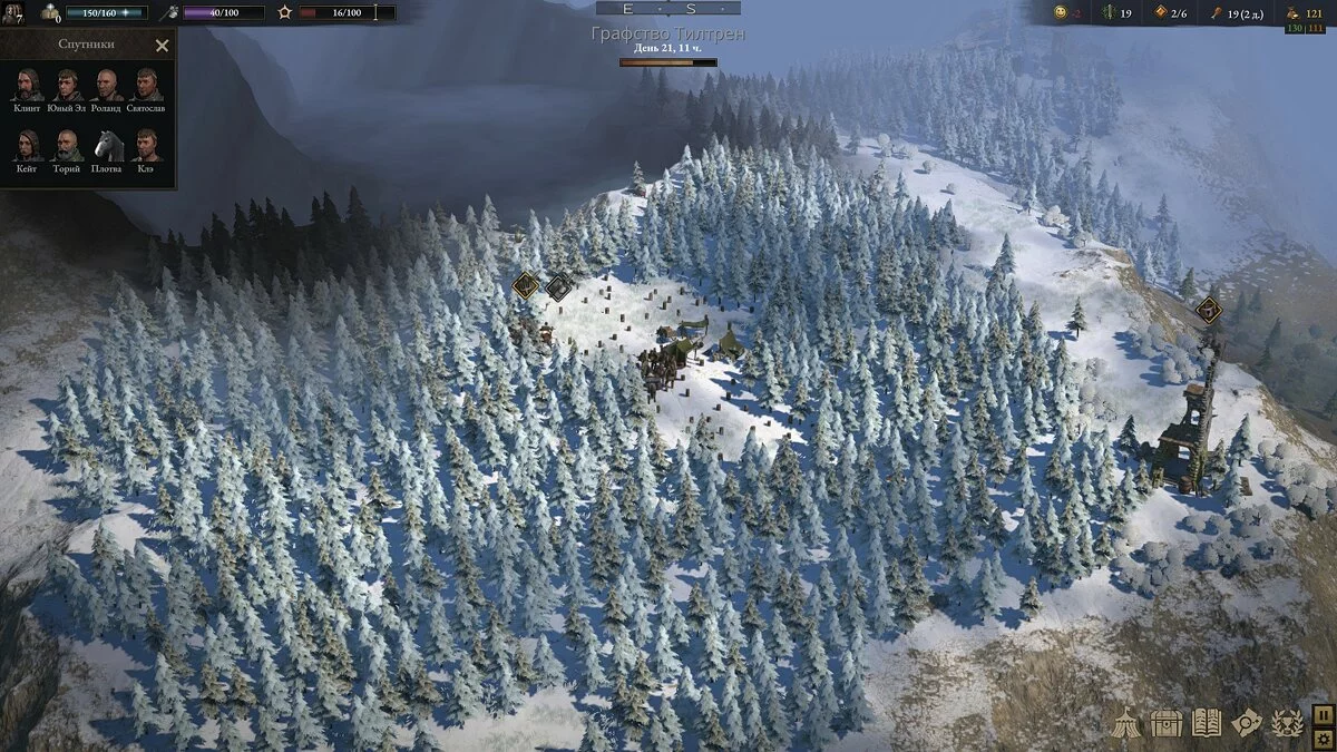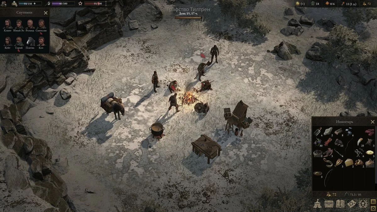 Также их нужно кормить: в идеале питание не должно быть скудным — лучше бы поставить в лагере котёл и найти повара, который приготовит хотя бы простые блюда. В конце концов, юниты хотели бы спать не под открытом небом, а, как минимум, в палатке.