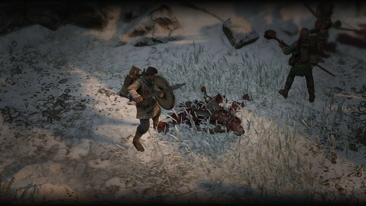 Геймплей Wartales можно поделить на два сегмента. Часть времени отряд мирно бродит по огромной карте, ищет приключения, принимает квесты, прокачивает отряд, пополняет запас расходников и так далее. Однако рано или поздно на пути у компании встанут бандиты, голодные звери или недовольные стражники — с ними придётся скрестить мечи.