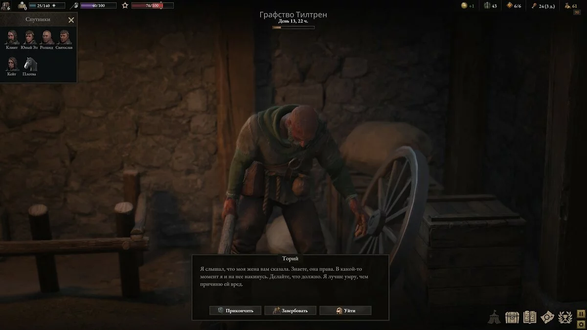 Другое задание потребует разобраться с проблемой голодающих крестьян. Неподалёку от их владений есть производство, которым владеет вредный дядька. Он давно не пользуется имуществом, но и отдавать его никому не хочет. В итоге вы можете либо запугать NPC, либо потратить очки влияния, который являются ценным ресурсом. Если запугаете, готовьтесь бегать от стражи, пока та не забудет о вас.