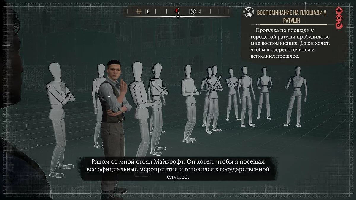У нас есть система, которая позволяет прицепить улику на экран. Ты можешь выбрать улику, включить режим концентрации и увидеть описание людей, которые зависят от неё. То же самое с костюмами: надевая разные костюмы и включая режим концентрации, ты можешь видеть, как люди к тебе относятся. Таким образом ты понимаешь, к кому из них стоит обратиться. Надев костюм полицейского, очевидно, что идти с вопросами к бандитам не стоит.