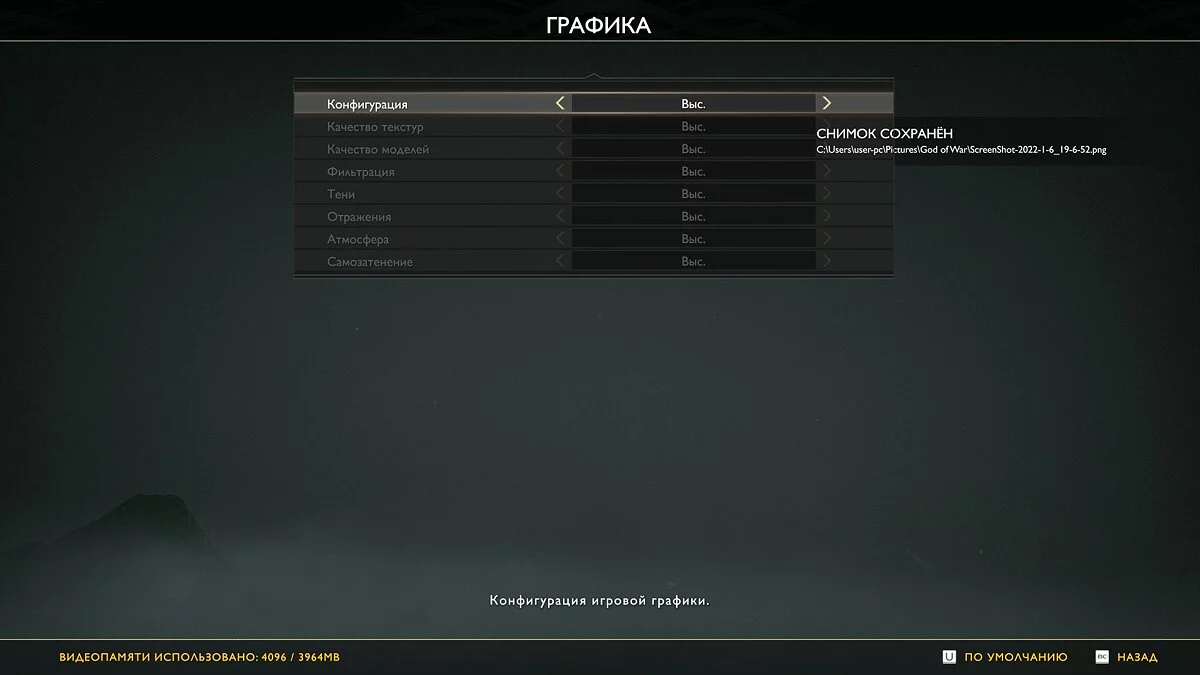 Я тестировал PC-версию на двух сборках. Первым делом God of War была установлена на ноутбук с GTX 1650 Ti, 16 Гб оперативной памяти и процессором AMD Ryzen 5 3550H. Такой системы хватило, чтобы задрать настройки до «высоких» в Full HD и получить вполне комфортные 45 — 50 FPS.