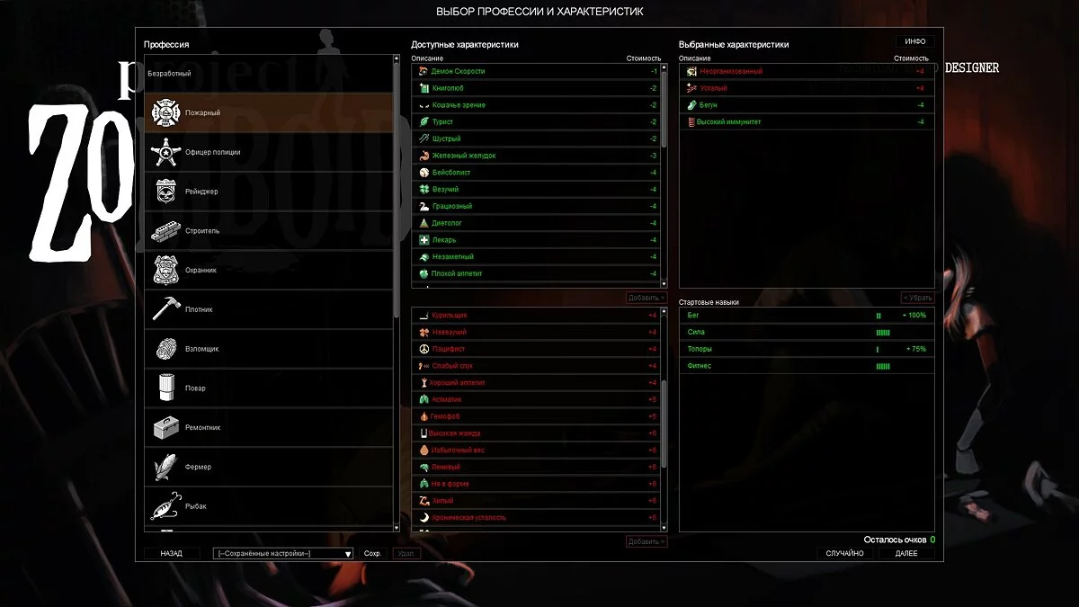 Визуальный редактор персонажа простенький. Можно выбрать цвет кожи, страшненькую одежду, кепку и прочие мелочи. А вот с характеристиками всё интереснее: в наличии солидное количество как позитивных, так и негативных способностей.