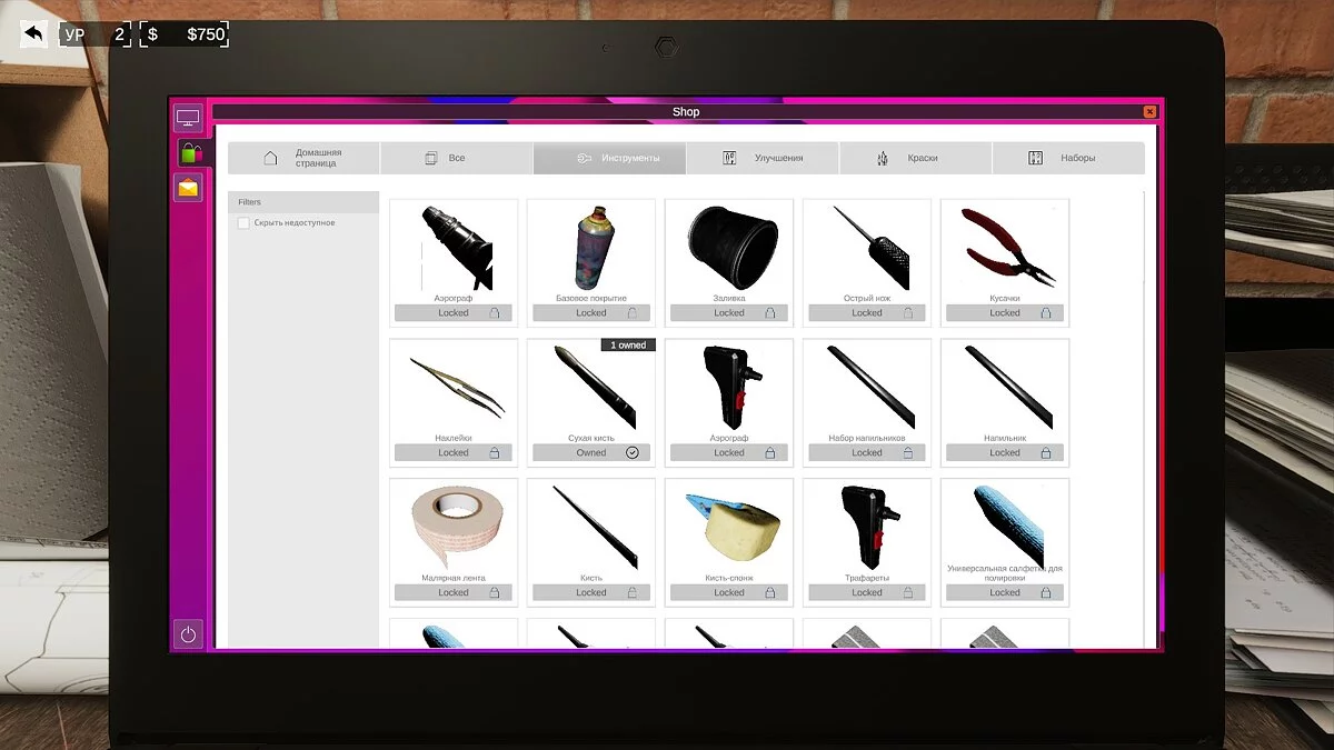 Подумать предстоит и о заработке на своем увлечении: добыча деньжат происходит через выполнение заказов — например, в подарок на день рождения коллеге или для съёмок фильма. Полученные гонорары можно тратить в магазине, в котором есть масса новых инструментов, красок, фонов и улучшений. По ходу игры будут открываться и новые мастерские.