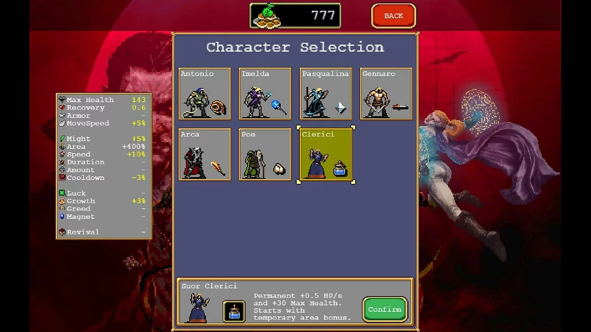 К примеру, у Дженнаро изначально есть пассивка, увеличивающая количество оружий. Если обычный герой поначалу будет кидать по врагам лишь один топор, то Дженнаро сразу швырнёт два. А вот у старика Поэ сниженное количество здоровья, но зато он притягивает предметы на большем расстоянии и сходу орудует имбовым чесноком. Всего таких героев 13.