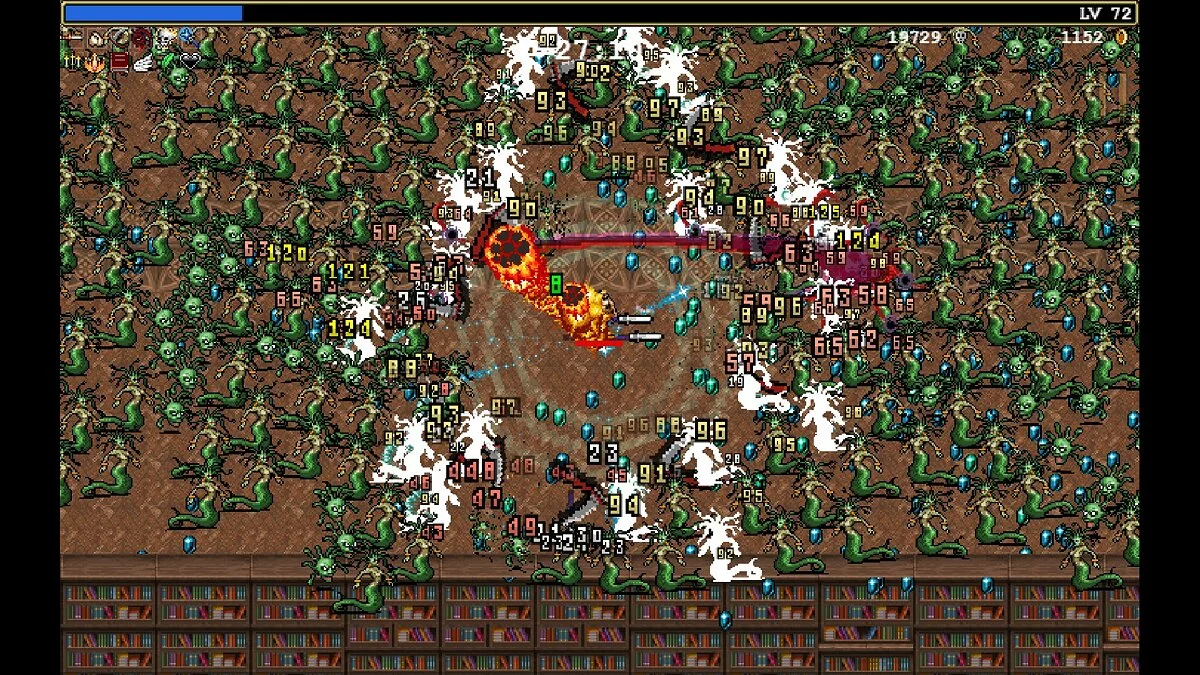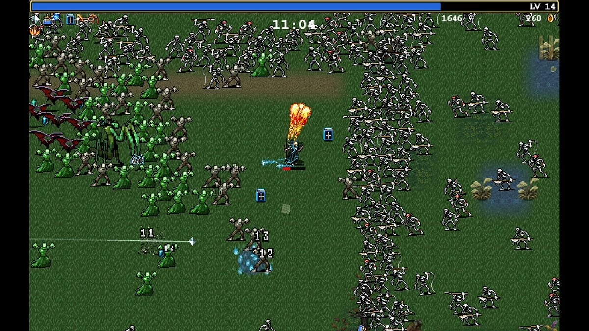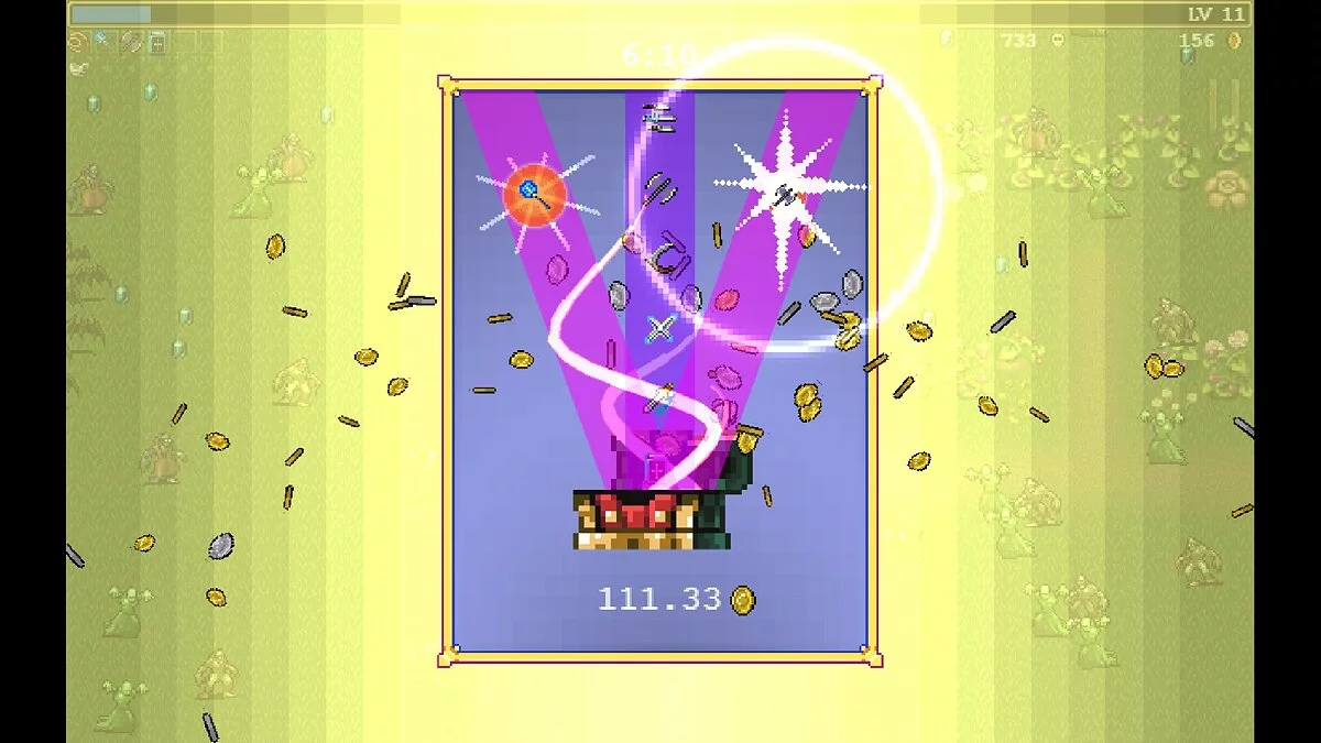 Плюс по карте разбросана восполняющая здоровье еда, а из поверженных неприятелей выпадают особые предметы — они останавливают время, превращают персонажа в притягивающий очки опыта магнит, уничтожают всех негодяев на экране и много чего ещё. Чтобы добраться до подобных ценностей, зачастую придётся продумывать маршрут.
