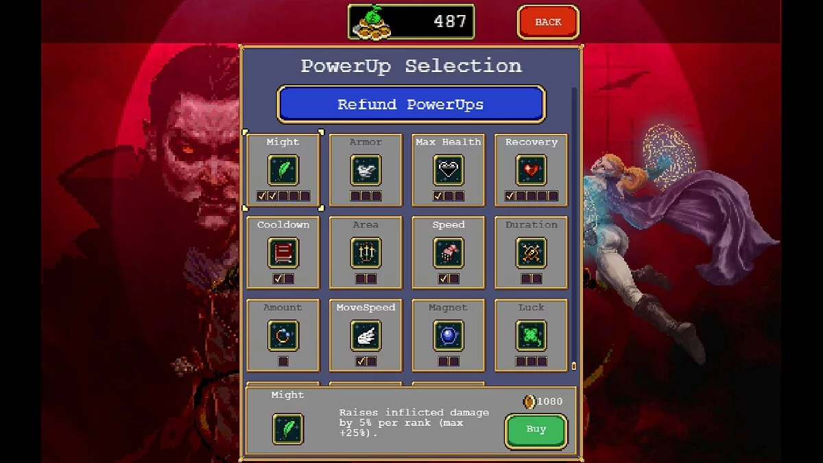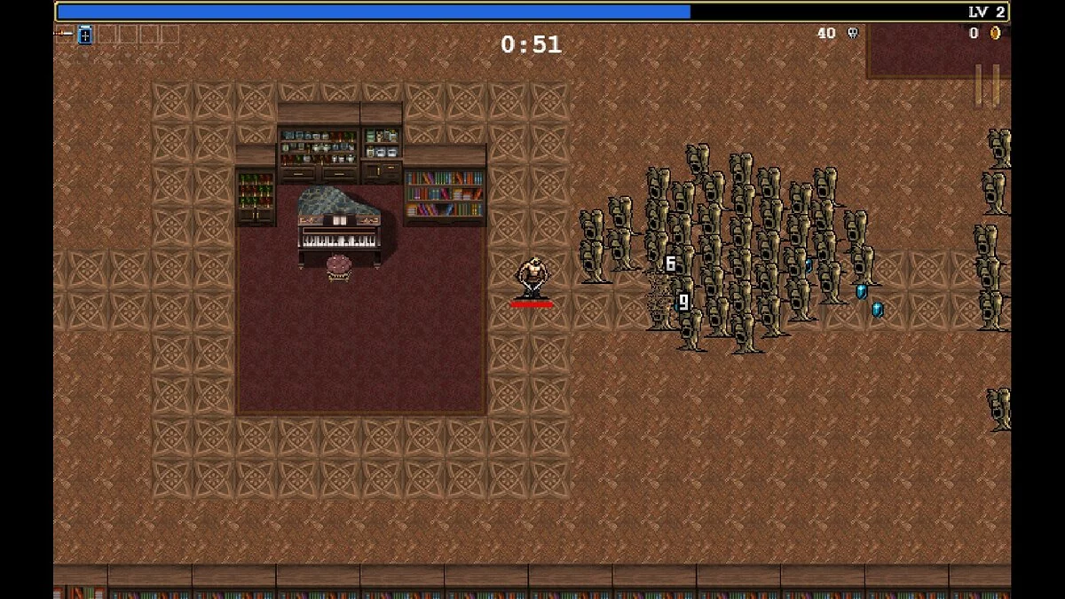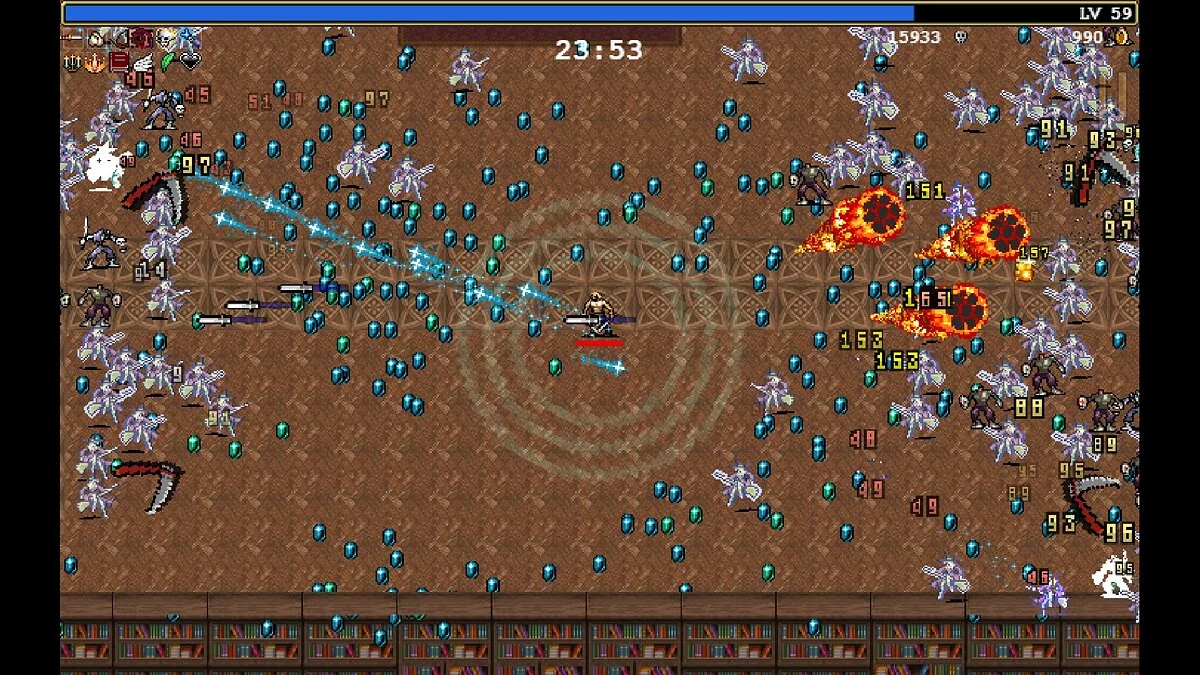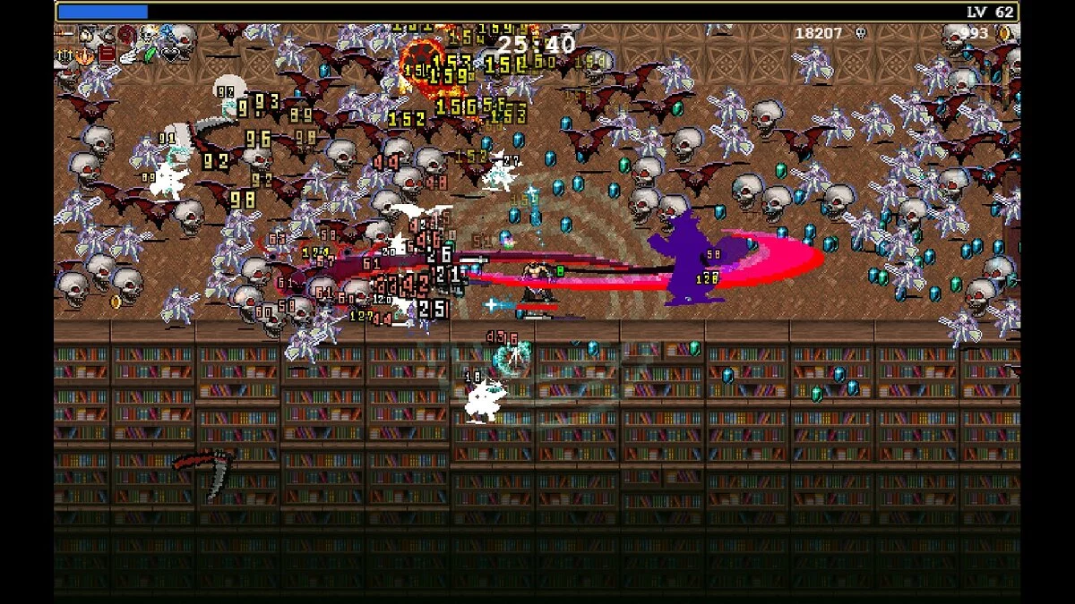 Механика «рогалика» добавляет Vampire Survivors интереса. Пусть система элементарная, но, учитывая залипательный геймплей, всегда хочется собрать кошелёк монет потолще, освоить побольше навыков и побить рекорд проведённого на уровне времени.