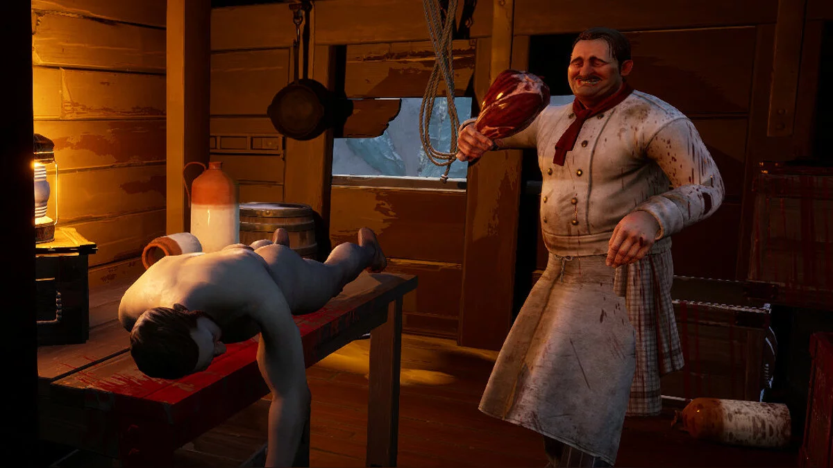К слову о ключах. После первой смерти игроки попадают в карцер на корабле. Здесь им дается шанс рассказать о своей смерти и доказать напарникам, что он не предатель. Проверить подлинность слов можно, обшарив свежий труп погибшего. Если у него на теле есть особые кости, то он тралл. Конечно, его напарник может опередить простых игроков и скрыть остатки трупа, но это уже как повезет. Так вот, чтобы открыть дверь карцера, нужен особый ключ. Их в игре не так уж и много, а мест для использования — предостаточно. Либо сундук с лутом открыть, либо дать другому игроку шанс.
