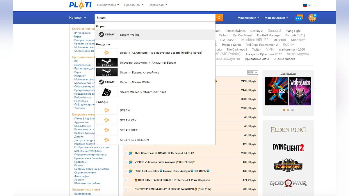 - Зайдите в раздел Steam Wallet на plati.ru.