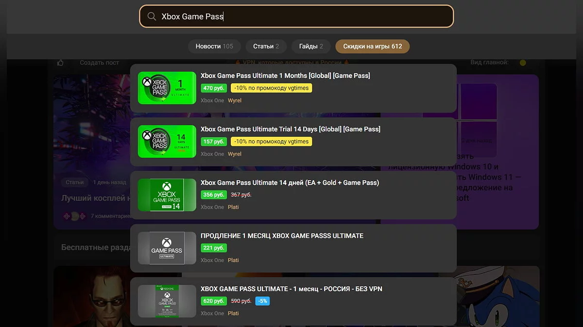 - Введите в поисковике «Xbox карта» для пополнения счёта, «Xbox Game Pass» для приобретения подписки или название конкретной игры с припиской «Xbox», в зависимости от того, что вам нужно.