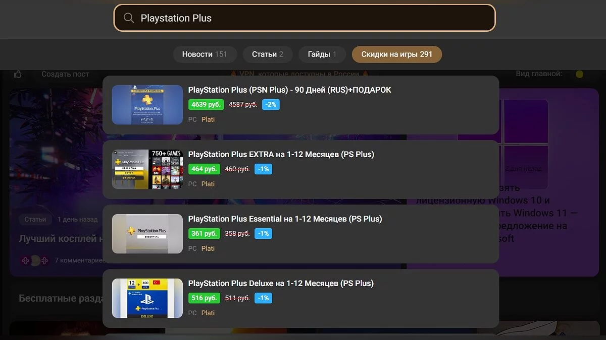 Аналогичным образом можно купить подписку PS Plus или карты оплаты с конкретным номиналом. В первом случае введите в поисковике «PS Plus», во втором — «PS Store».