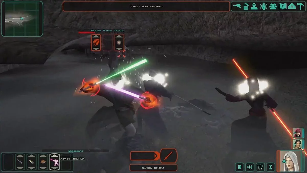 По духу сиквел был куда темнее и мрачнее оригинала. История стартует спустя пять лет после событий первой KOTOR. Завязка с главным героем, который проснулся на корабле и не понимает как там оказался, полностью копирует сценарные ходы BioWare. Сам же протагонист является джедаем-изгнанником, лишившимся своих сил после противоречивых действий в Мандалорской войне. На судне он обнаруживает странную старушку Крею и контрабандиста. Они рассказывают, как новый злобный и опасный темный владыка Дарт Сион держит в страхе всю галактику. Мир KOTOR II отчетливо напоминает конец третьего и начало четвертого эпизодов. Храм джедаев уничтожен, а остатки ордена разбрелись по разным планетам. Наша цель собрать их вместе, узнать свое прошлое, дать отпор темной стороне и восстановить орден джедаев. Или примкнуть к ситхам и устроить настоящий ад для жителей далекой галактики.