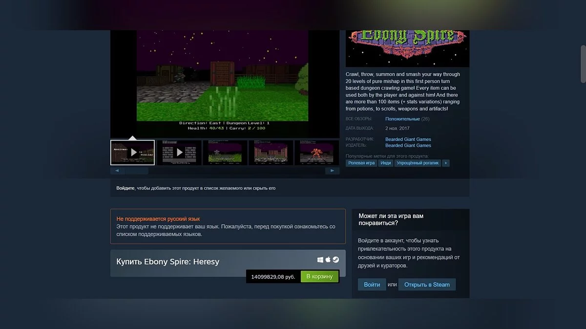 Ebony Spire: Heresy — самая дорогая игра в Steam, её покупка обойдётся в 14 миллионов рублей. Кто-то может подумать, что дело в санкциях, однако стоит запустить этот хит, как становится ясно: невероятное качество оправдывает высокую стоимость. Мы распаковали пару доставленных в редакцию чемоданов с купюрами, купили новинку и спешим поделиться впечатлениями!