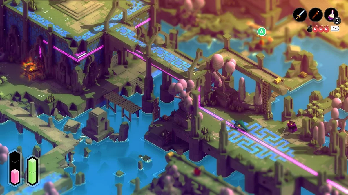 По жанру TUNIC — изометрический экшен. Герою предстоит исследовать хитро переплетённые локации, сражаться с рядовыми врагами, бить боссов и искать предметы, без которых по сюжету не продвинуться. К примеру, первая задача — стукнуть по двум колокольням, отпирающим золотые врата: сделать это непросто, ведь нужные места запрятаны и находятся под охраной.