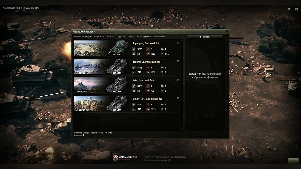 Предоставляет возможность управления записями прямиком из игрового клиента. Все реплеи отображаются в отдельном окне. Есть сортировка и фильтрация для упрощения поисков видеороликов. Модификация позволяет просмотреть результаты записанного боя и загрузить реплей на сайт.