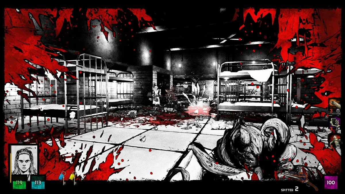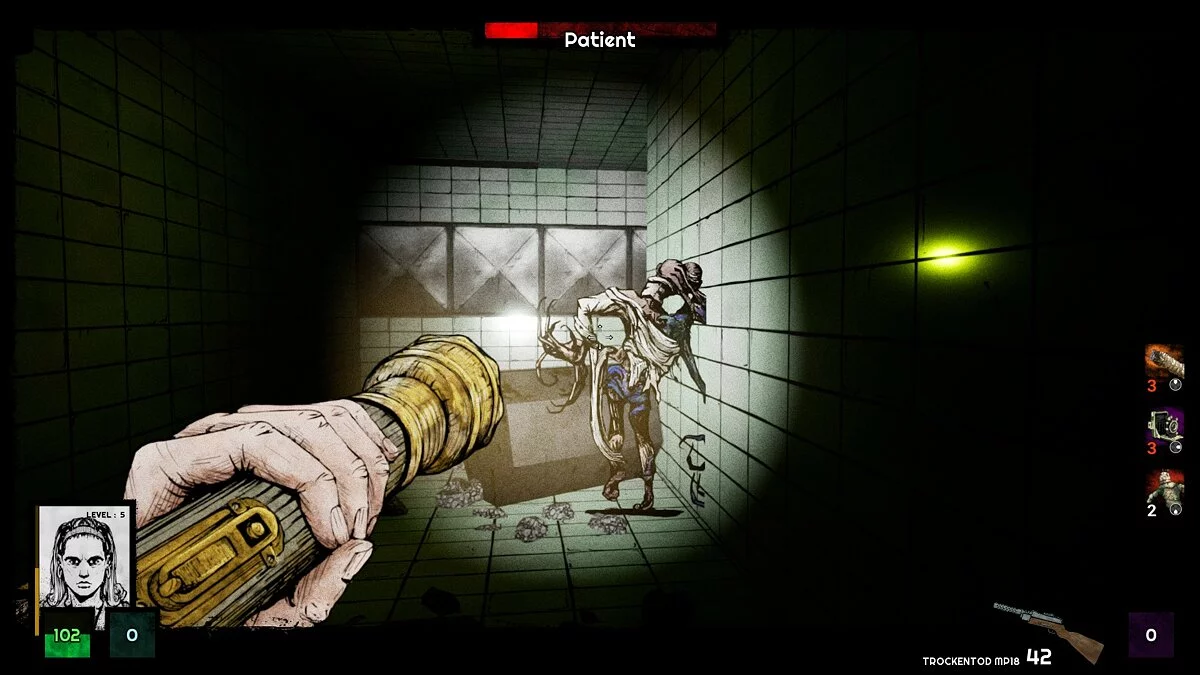 Если персонаж шустро отстреливает врагов одного за другим, уровень безумия растёт. Чем он выше, тем больше урона наносят выстрелы и тем быстрее перезаряжаются расходники. Минус разве что в искажённой картинке, сквозь которую сложнее разглядеть противников. Впрочем, выгода несоизмеримо больше, так что изменившийся визуал не напрягает.