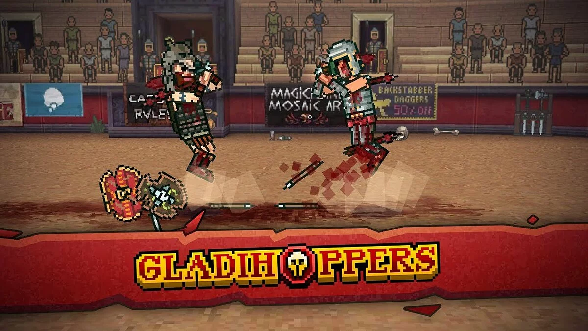 Gladihoppers — забавная бесплатная игра о гладиаторах, сочетающая 2D-физику со стандартной 2D-анимацией. Боевая система завязана на боевых стойках и сочетании ударах разной степени мощности (слабые и сильные), однако бои ведутся и на дальних дистанциях тоже — с помощью копий. Ещё в игре есть семь уникальных арен, кастомизация персонажей и различные режимы, среди которых быстрые дуэли на одном устройстве с разделенным экраном.