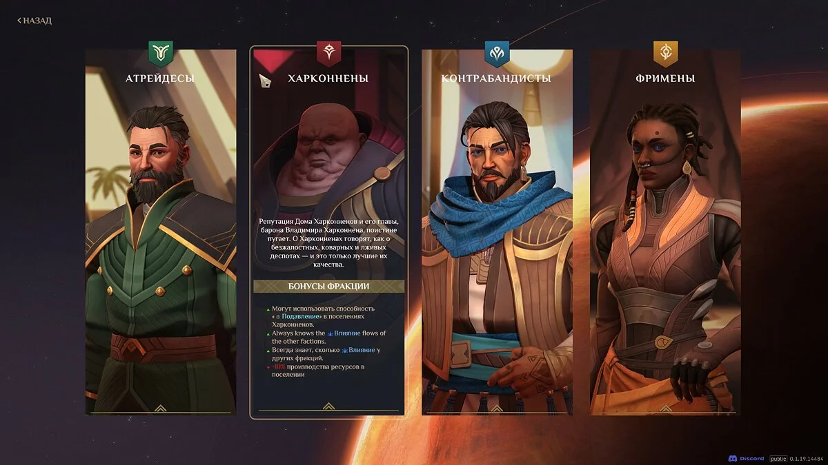 На выбор есть четыре фракции: Атредейсы, Харконнены, контрабандисты и фримены. У каждой стороны свои фишки.
