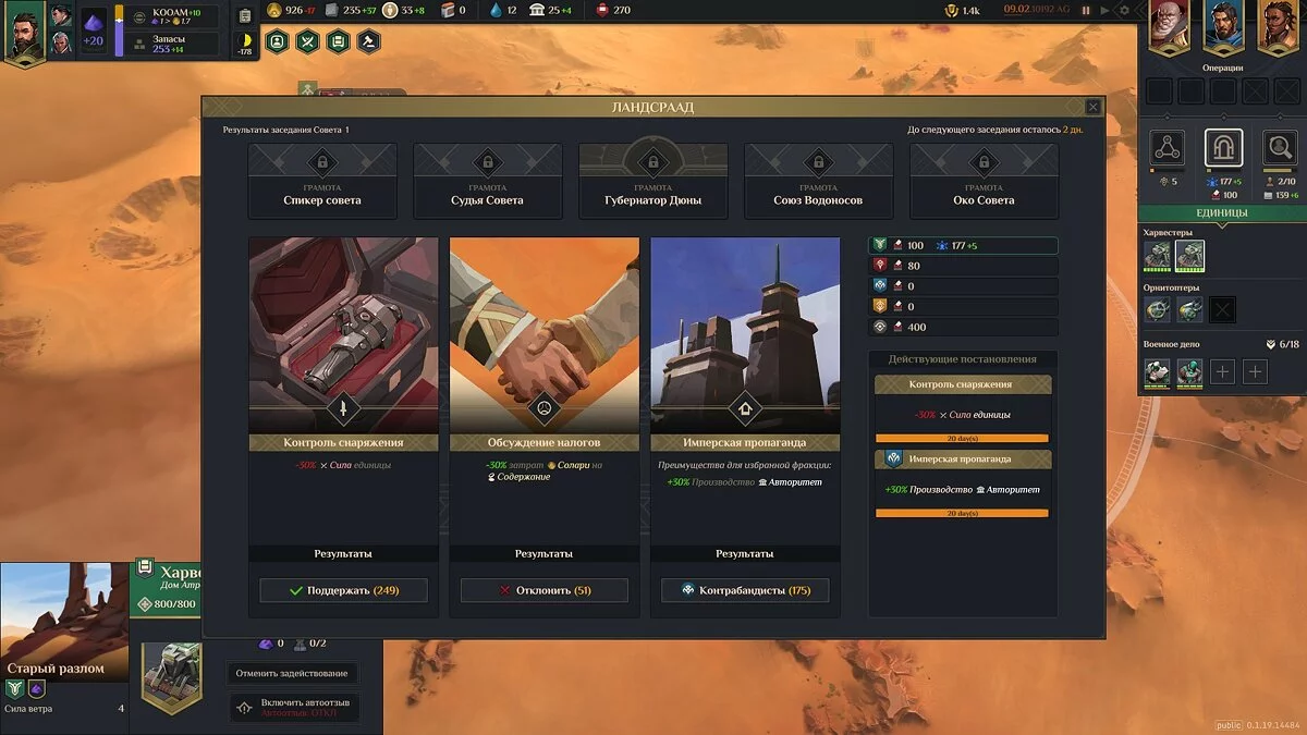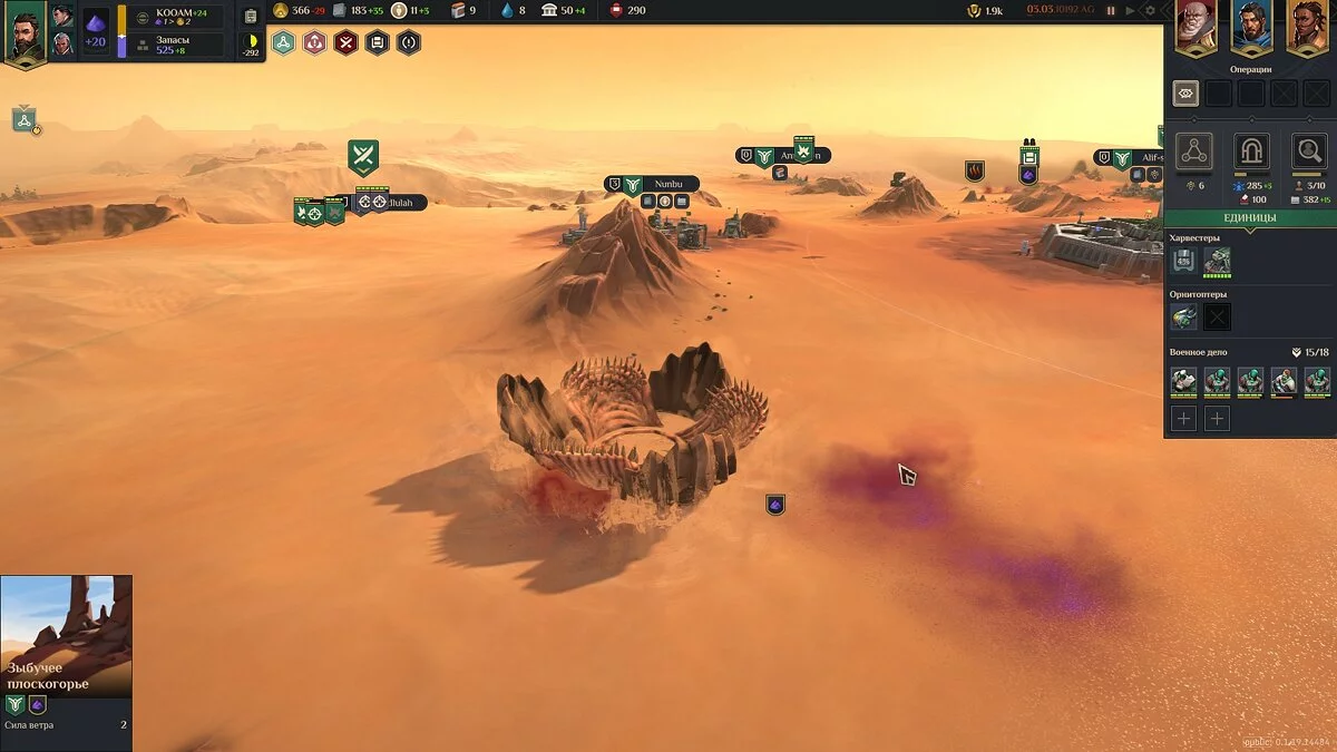 Впрочем, самый важный ресурс — пряность. Если не наладить его добычу, поражения не избежать. Всё-таки Император не просто так отправил вас на Арракис. Он требует регулярно платить налоги, а валютой выступает именно Пряность. Если не соберёте к нужной дате требуемое количество, Дом получит такие штрафы, что оправиться от них будет непросто.