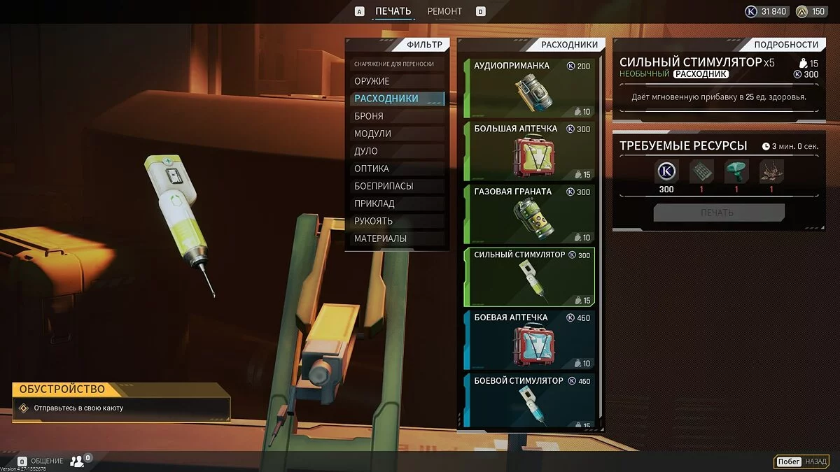 Подготовка к вылазке ведётся в небольшом хабе. Там есть принтер, где можно напечатать крутую экипировку — для этого понадобится много редких материалов, да и подождать придётся, однако результат того стоит. Плюс герой проживает в каюте, которую стоит прокачать.