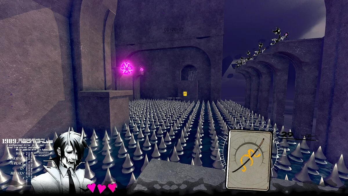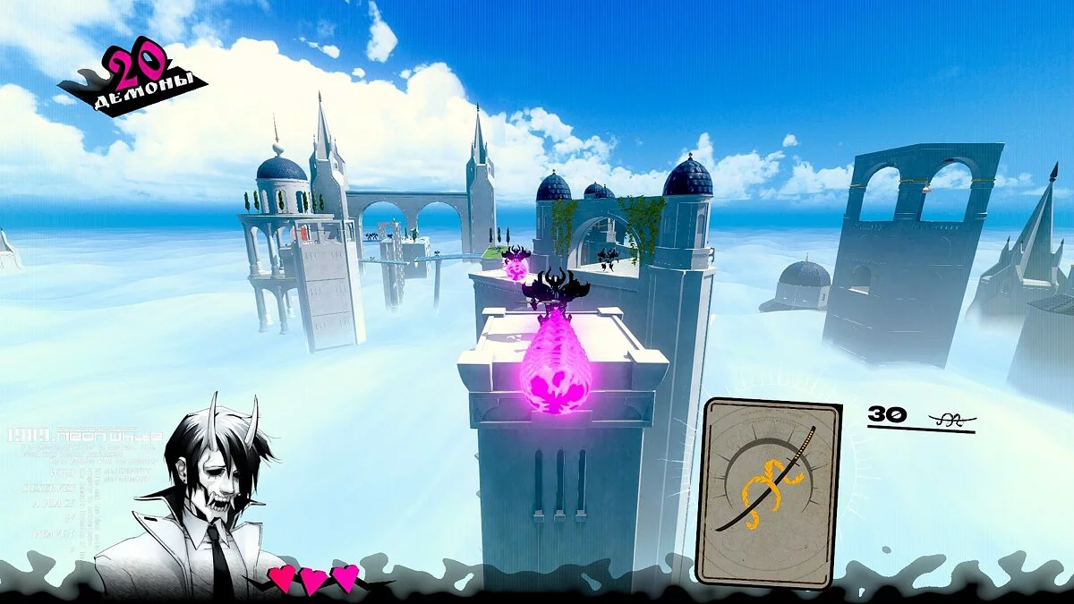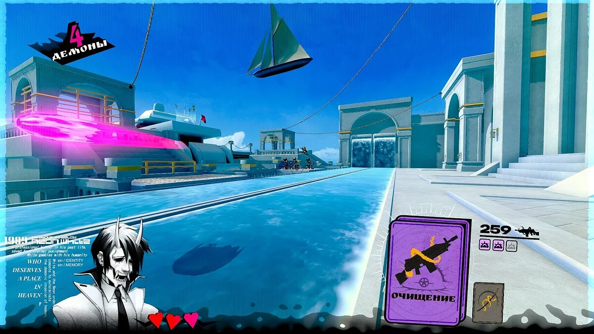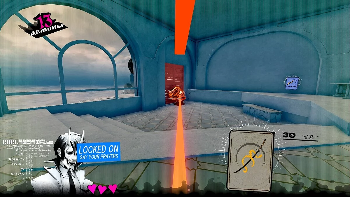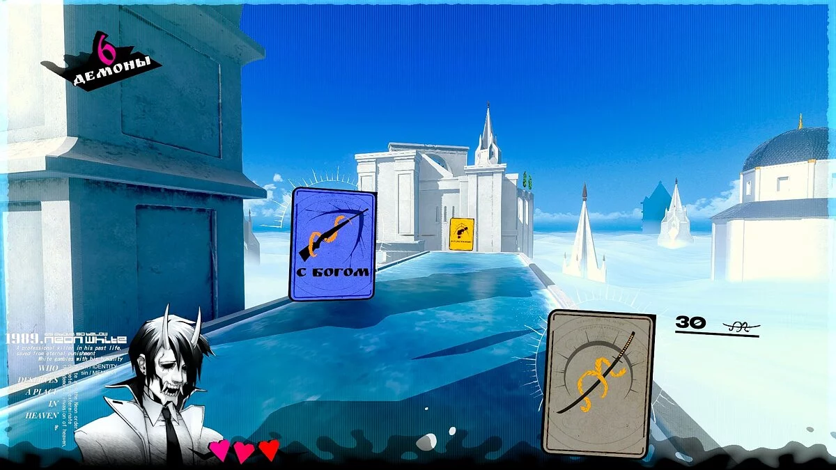 В плане экшена игра напоминает занятное комбо из DOOM и Ghostrunner. Каждое задание — цикл испытаний, где герою нужно стремительно пролететь по локации, перебить всех демонов и запрыгнуть в портал. При этом на фоне всегда тикает таймер: чем быстрее выполните поручение, тем больше респекта получите. Плюс каждая золотая медаль продвигает Белого в рейтинговой таблице — всё-таки не стоит забывать, что место в Раю получит лишь один неон.