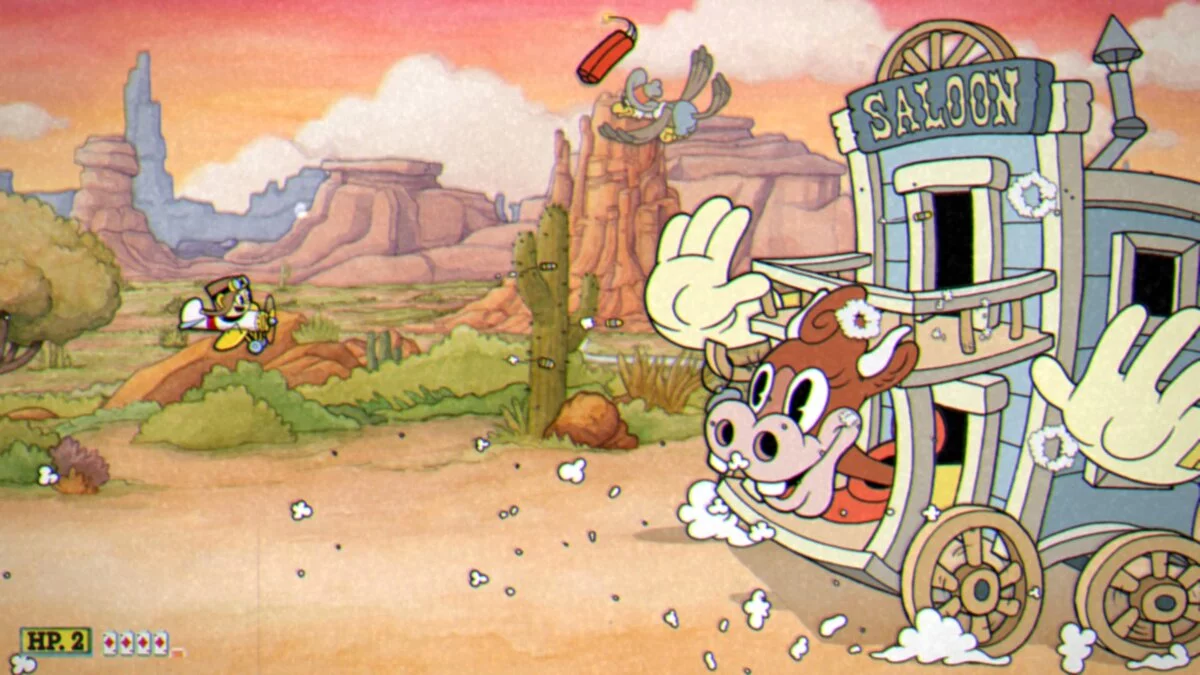 Боссфайт, где персонаж сам управляет самолётом и расстреливает противника, тоже в наличии. Поединок с Коровой вышел любопытным: в начале животное едет в карете и отстреливается из пушек, а к последней фазе превращается в консерв и палит сосисками.