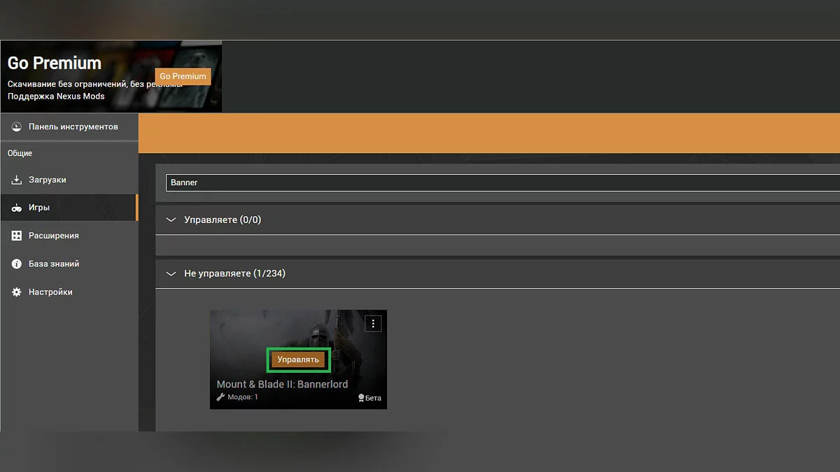 - Вводим в окно поиска Mount & Blade, выбираем игру и нажимаем «Управлять». Если игра не нашлась автоматически, понадобится вручную задать местоположение её папки.