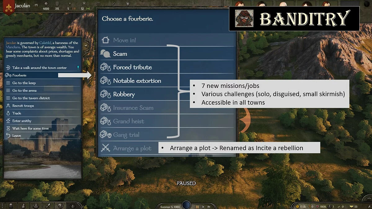 Fourberie (Cunning) расширяет возможности отыгрыша за криминал. Теперь игрок может взаимодействовать с главарями банд, бродячими разбойниками, лордами и различными укрытиями. Также сильно расширен функционал городов.