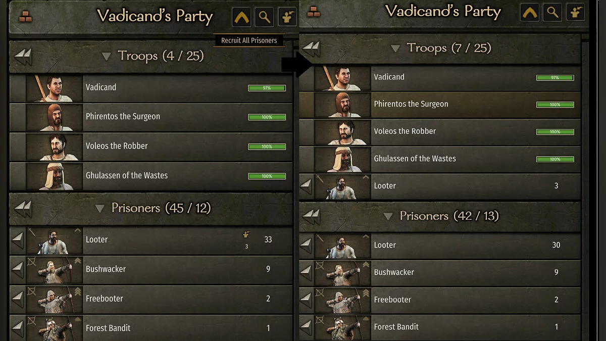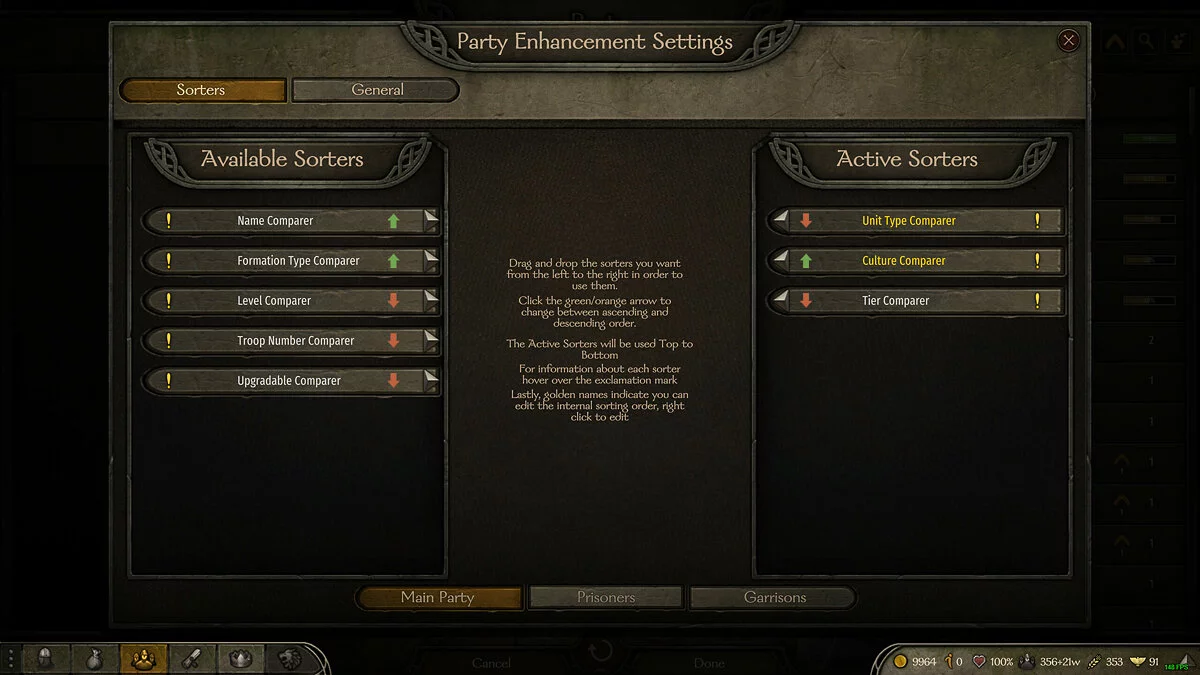 Небольшой мод Party Screen Enhancements делает игровой процесс удобнее. Он добавляет в панель отрядов такие кнопки, как «Улучшить всех», «Сортировать всех», «Нанять всех заключенных», а также позволяет настроить сортировку членов отряда.