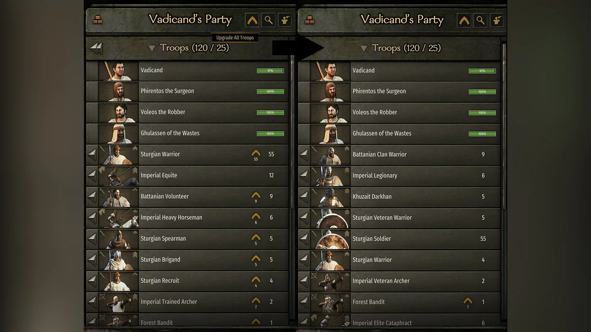 Также мод позволяет отключить ненужные логи и показать соотношение типов войск в отряде. Рекомендуем заглянуть в описание мода — там автор подробно рассказал о настройке сортировки и кнопке «Улучшить всех». В общем, это небольшая, но очень нужная на поздних стадиях игры модификация.