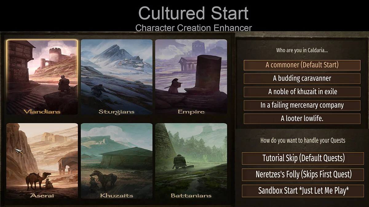 Cultured Start добавляет возможность альтернативного старта игры. Вы можете настроить предысторию персонажа, его начальные навыки, капитал и имущество, выбрать город для появления и принадлежность к определенной фракции. Также можно пропустить обучение.