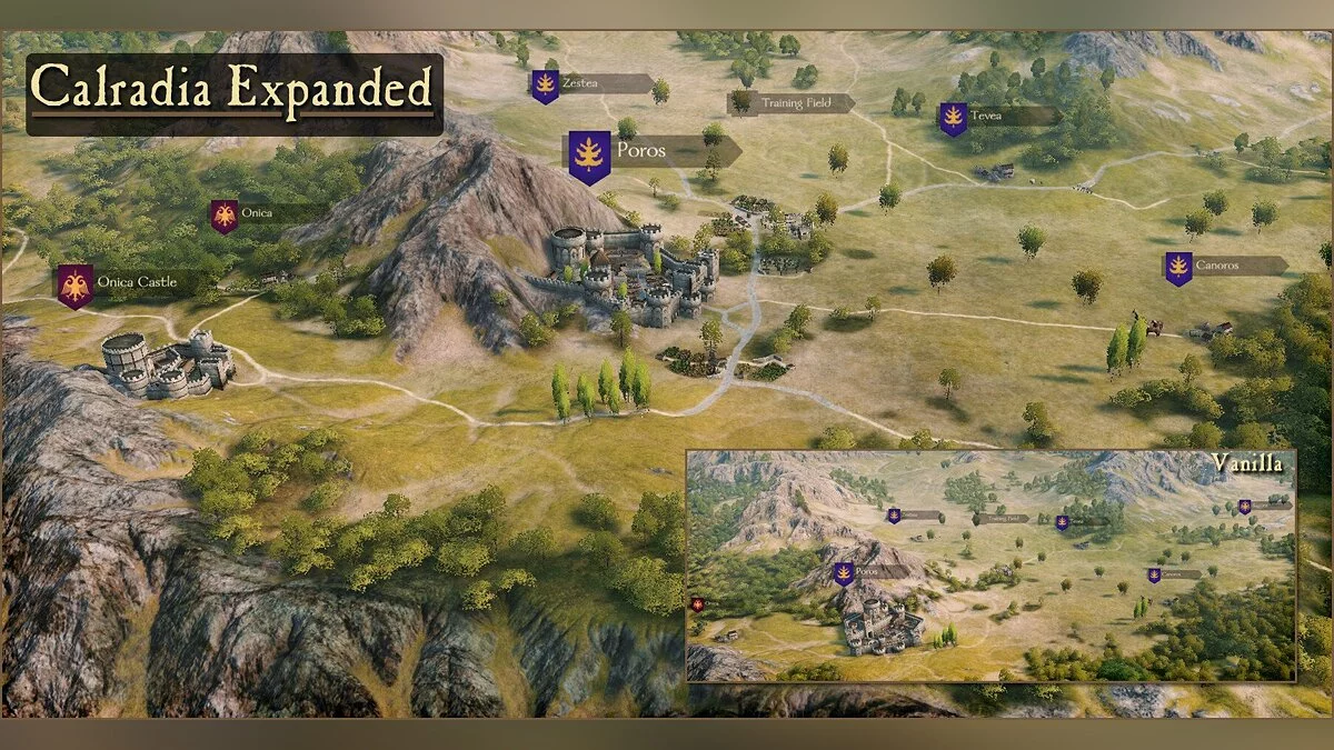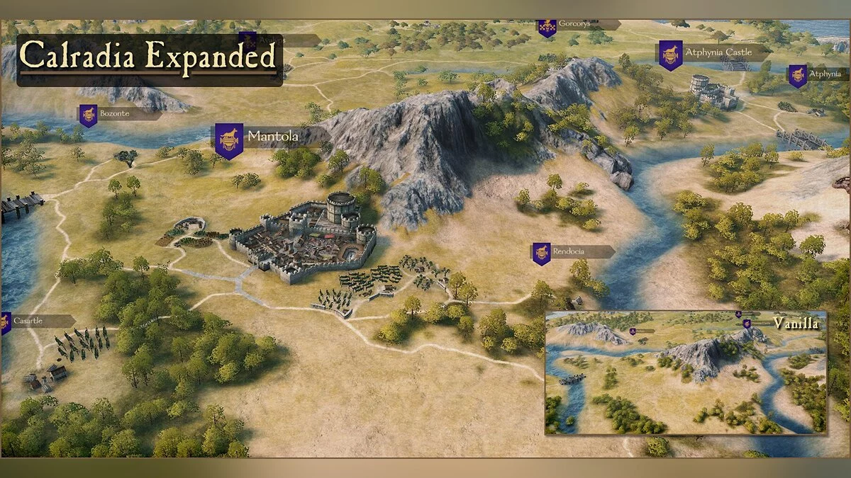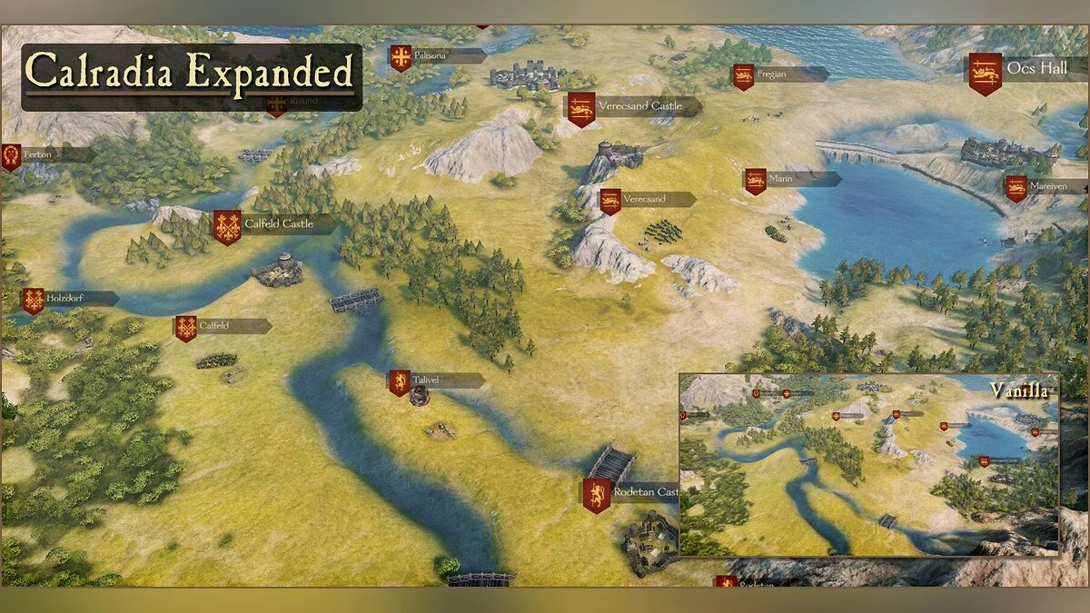 Calradia Expanded значительно расширяет мир игры, но не с помощью новых фракций, а с помощью территорий. На карте появятся 14 новых городов, 8 замков и 77 деревень. Некоторые ванильные города «переехали», чтобы соответствовать логике (глупо ставить замок в глуши, а не на важном переходе).