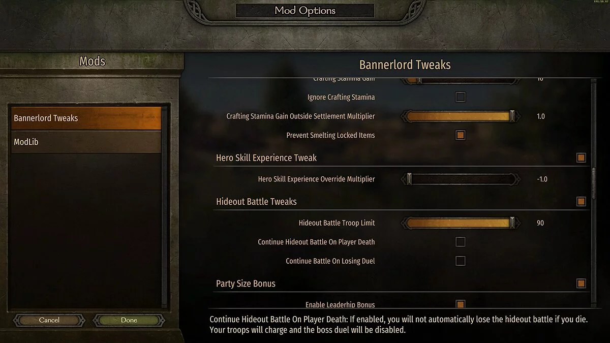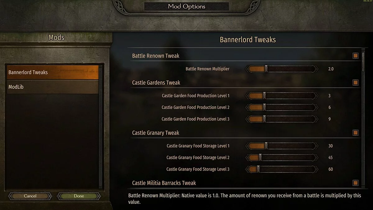 Ещё одна небольшая, но очень полезная модификация. Bannerlord Tweaks позволяет настроить игру «под себя» в достаточно широких пределах. Можно менять награды за победы в битвах и турнирах, увеличивать лимит компаньонов, караванов и кланов, вмешиваться в систему строительства, крафта и поселений.