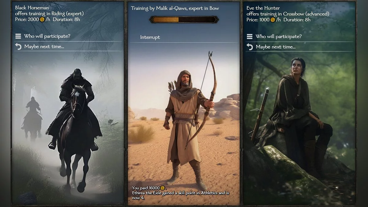 В городах появились учителя, которые поднимут ваши навыки и характеристики спутников за определенную плату. Добавлены «мирные» работы в полях для дополнительного заработка на ранних этапах, возможность тренировки за деньги.