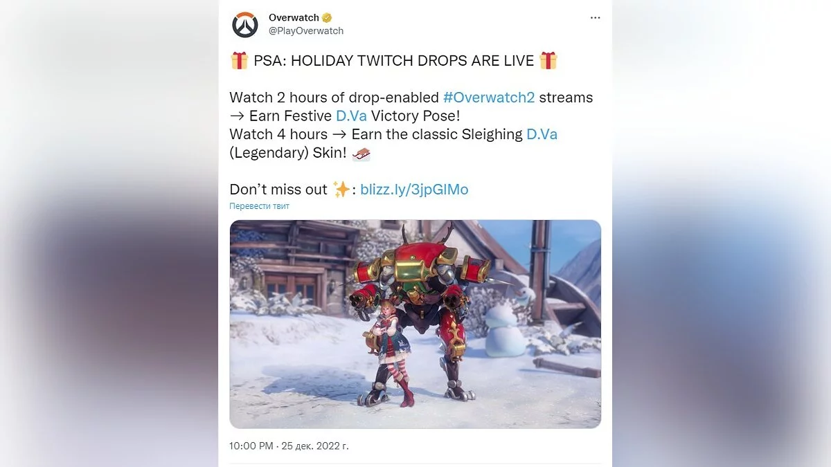 Компания при этом сделала рождественскую раздачу позы и скина на D.Va. Правда, для этого придется смотреть стрим два либо четыре часа на Twitch.