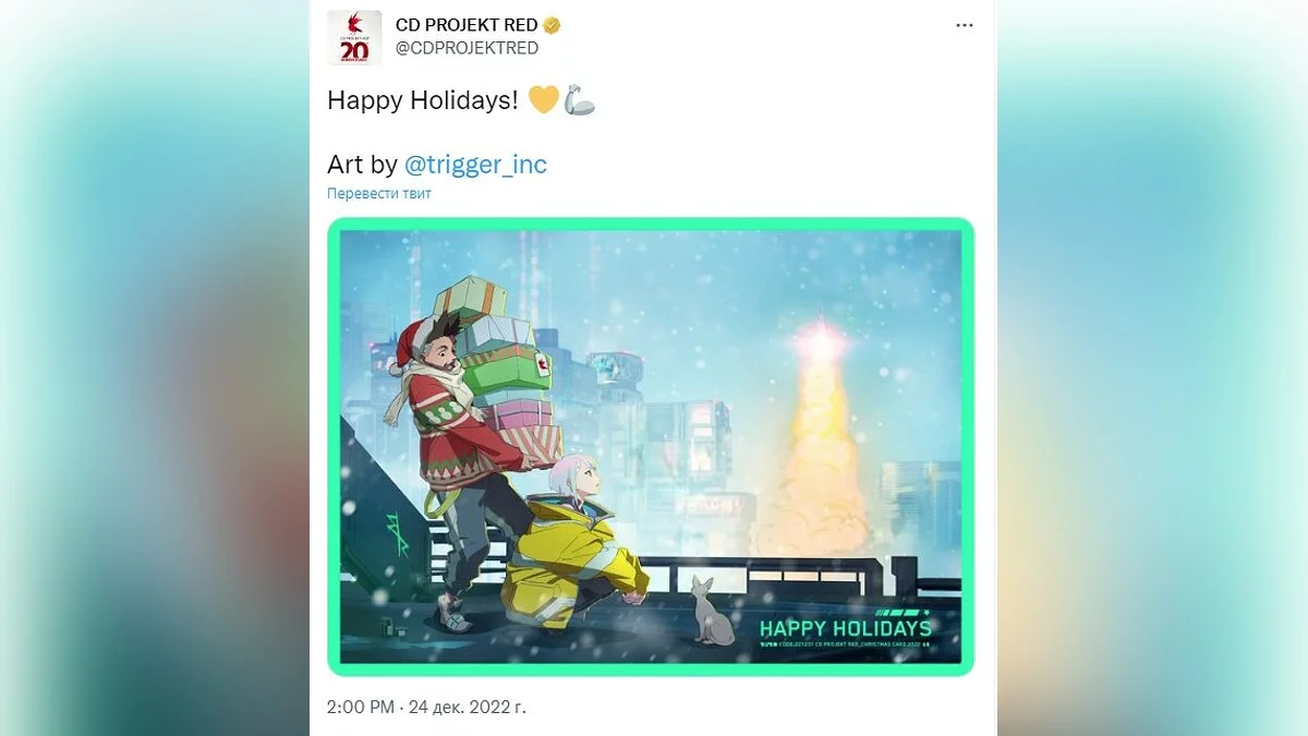 CD Projekt RED в этом году порадовала милейшей открыткой по мотивам аниме «Киберпанк: Бегущие по краю» (Cyberpunk: Edgerunners). Оказывается, в Найт-Сити тоже отмечают Рождество!