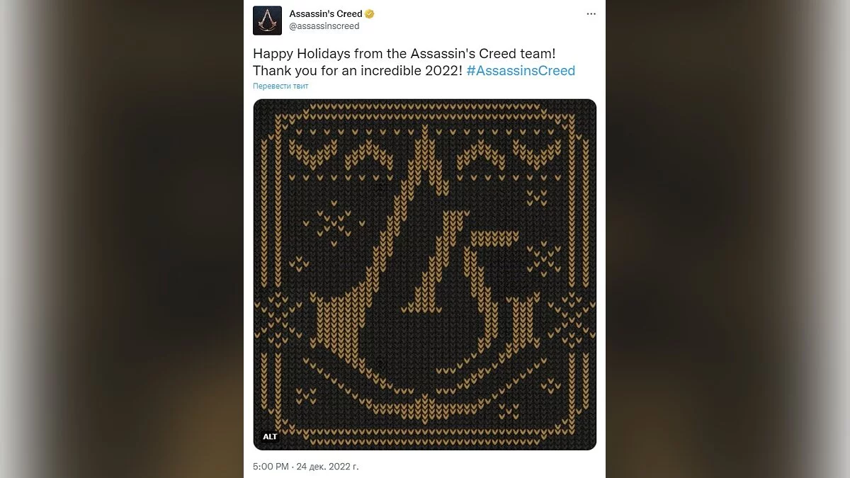 Авторы Assassin's Creed явно очень любят все теплое и вязаное, а потому и поздравили открыткой, похожей на узор свитера — только оленей не хватает.