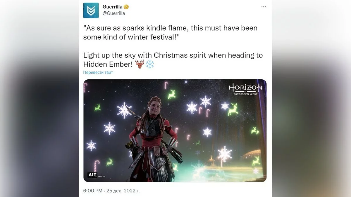 Guerrilla Games тоже присоединилась к тем, кто поздравляет игроков скриншотами — нам показали очень милую Элой в праздничной атмосфере. «Осветите небо духом Рождества!» — так говорят разработчики.