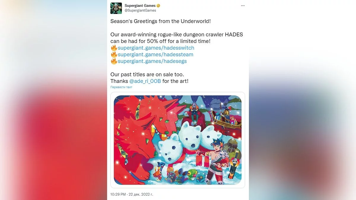 Supergiant Games передаёт сезонный привет из подземного мира и дарит скидку 50% в течение ограниченного времени на полюбившуюся всем Hades.