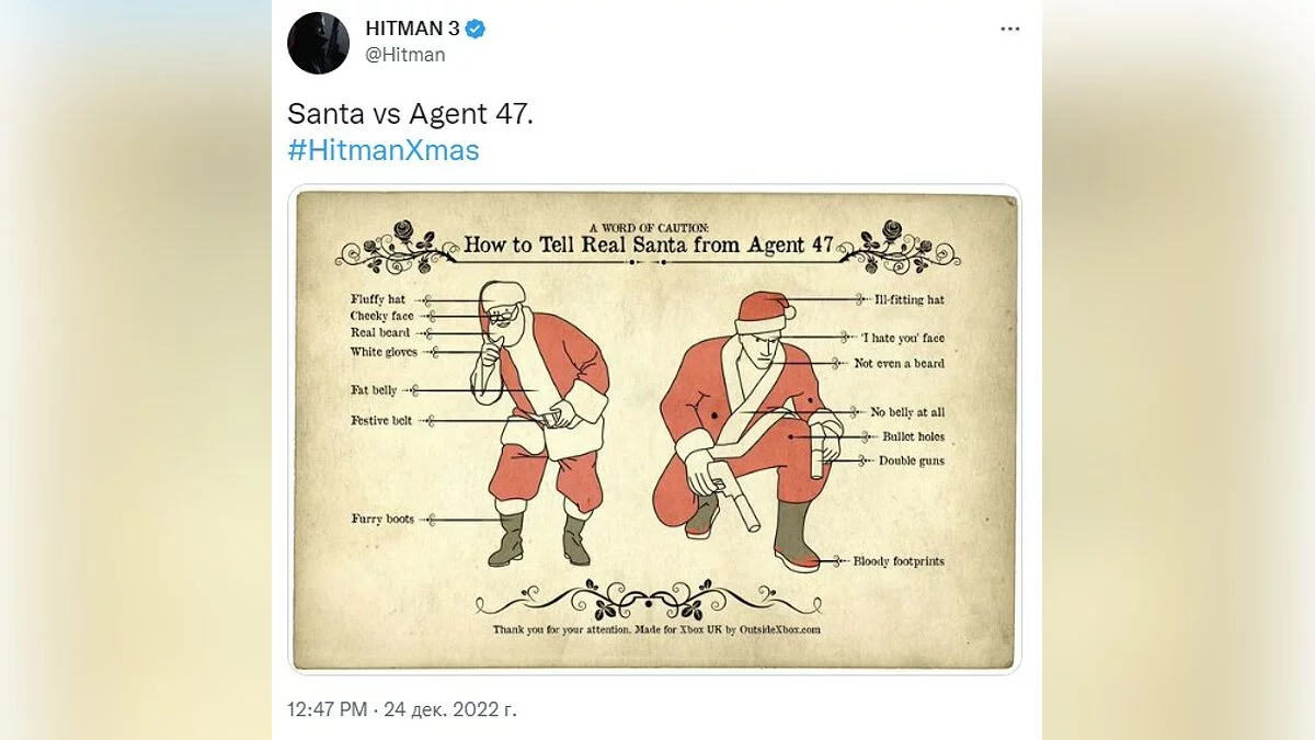 Авторы Hitman 3 вышли совершенно на новый уровень в создании открыток, они опубликовали поздравление в духе «Как отличить настоящего Санту от Агента 47». Теперь будем знать!