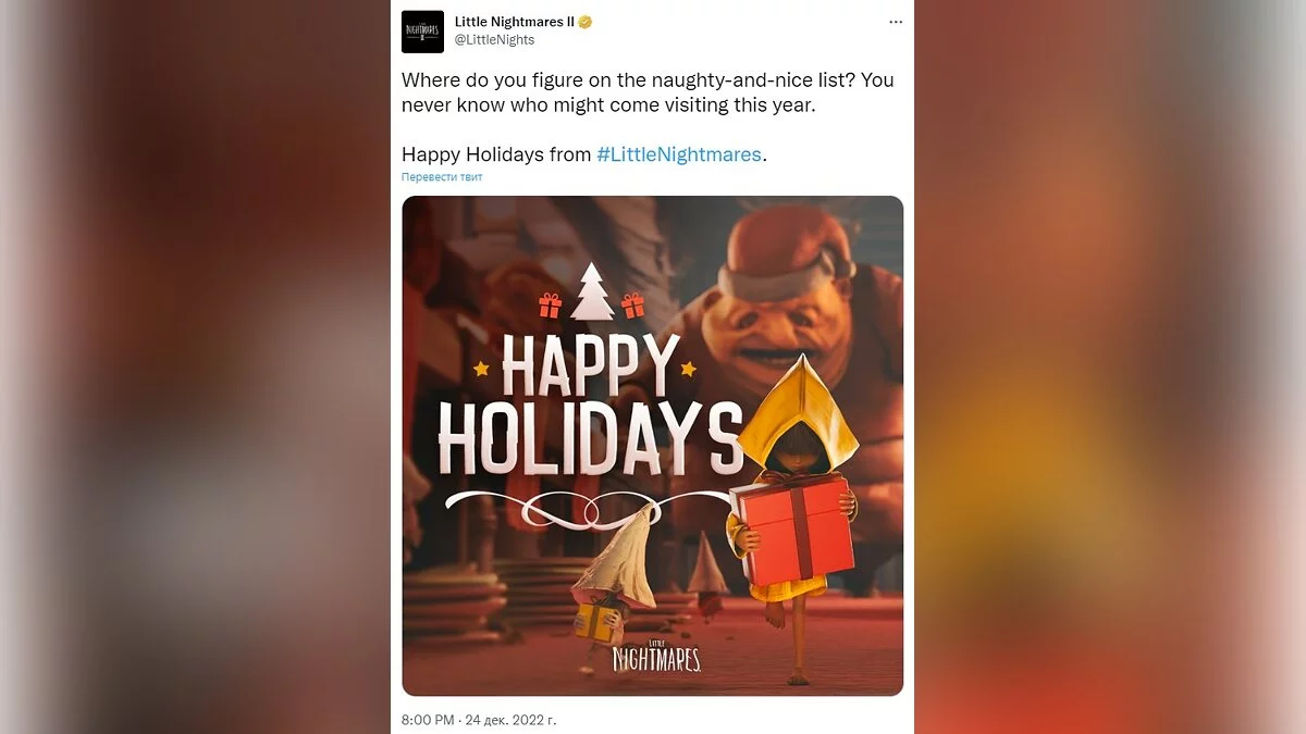 «Как вы относитесь к списку непослушных и хороших детей? Никогда не знаешь, кто может приехать в гости в этом году.» — таким рассуждают создатели Little Nightmares, делясь милейшей открыткой, в которой Шесть, очевидно, утащила у кого-то подарок.