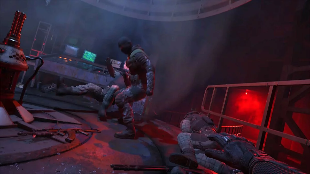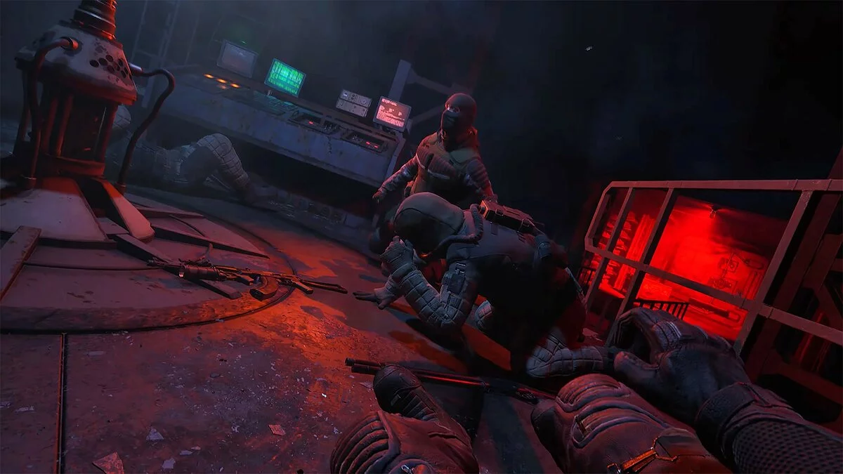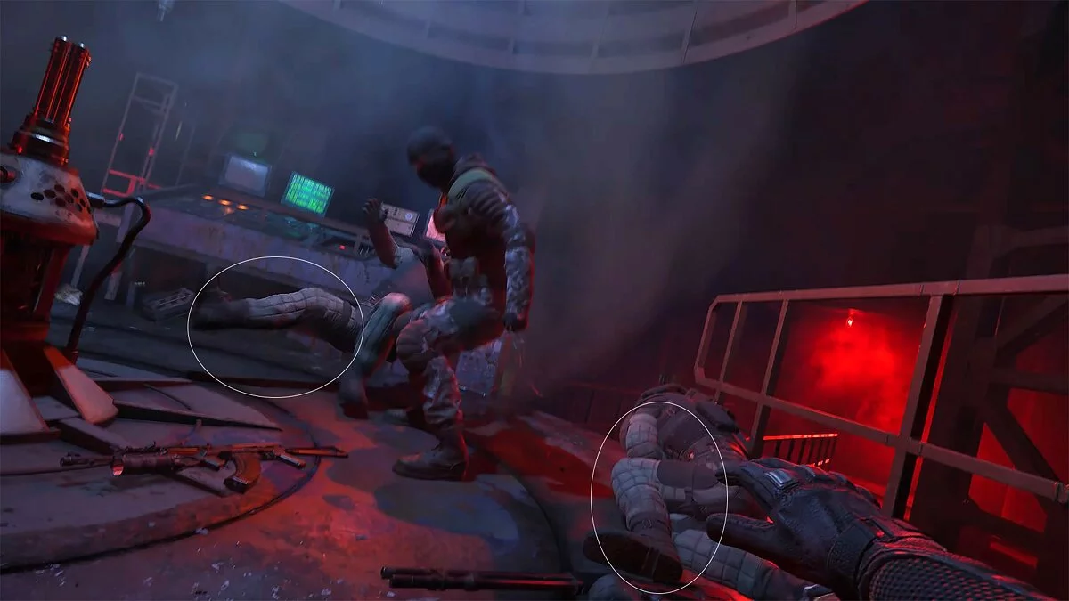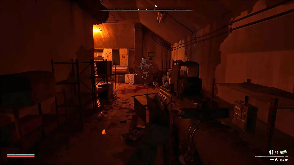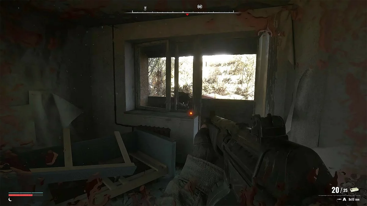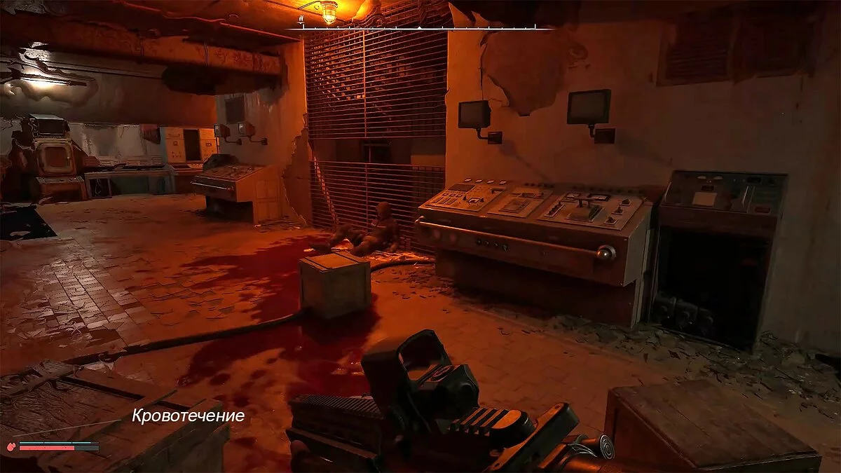 Наполнение помещения вполне соответствует разграбленной Зоне Отчуждения. Уничтоженные противники, вероятно, были наемниками. Анимации стрельбы на уровне обычных шутеров (импакт от неё померить по видео сложно, но камеру трясет знатно). При стрельбе из обреза есть возможность прислонить его к лицу (камере).